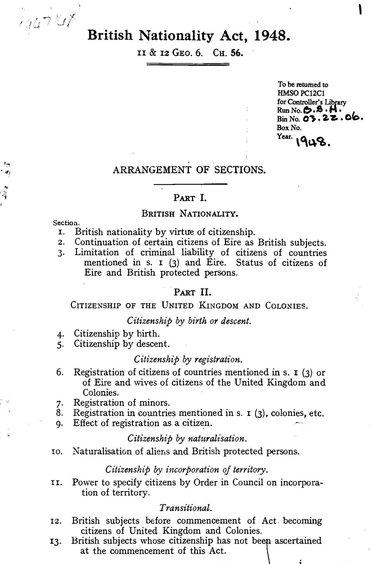 The British Nationality Act 1948 was an Act of the Parliament of the United Kingdom that created the status of “Citizen of the United Kingdom and Colonies” as the national citizenship of the United Kingdom and its colonies.